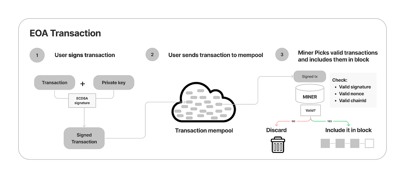 | Transaction | 可以發起、執行任何交易,可以支付 gas,當執行交易時,第一個帳戶就是EOA,並且支付gas (不管後續contract 怎麼呼叫外部合約都是由第一個帳戶來支付) | 只能接受交易時發送交易(ex swap, transfer),不能支付gas |